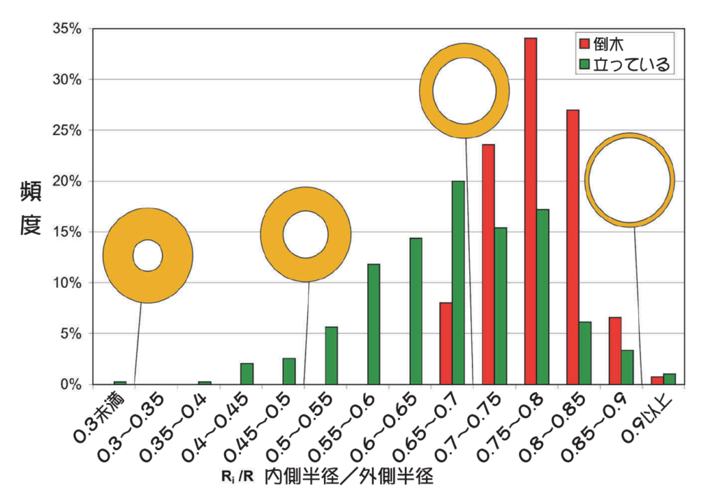 世界中で行った野外調査の結果は、半径70%以上に腐朽(空洞)が及ぶと急速に空洞樹木の倒伏率が上昇することを示している。