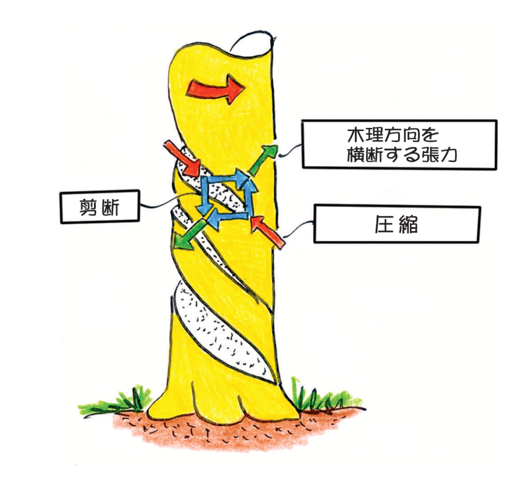 螺旋木理と逆方向のねじれによって生じるねじれ亀裂