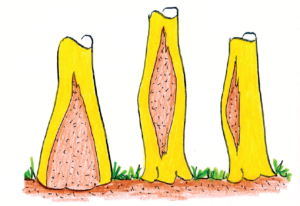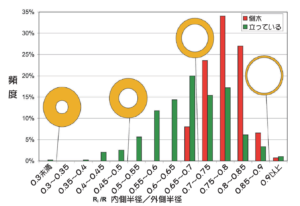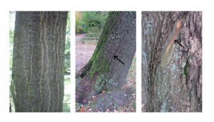 肥大による筋は通常、厚い樹皮を持つ木の表面に生じる、樹皮の間の明るい筋である。ブナのように樹皮の薄い樹木では、より 多くの細かい筋が生じ、極端な肥大成長を示す部分では、樹皮が規則的に裂けている。肥大による筋が示す情報は良いものと悪 いものがある。単純に活発な成長を示していることもあり、亀裂の開始のこともある。筋は力の流れを示していることがよくある。 [文献2]